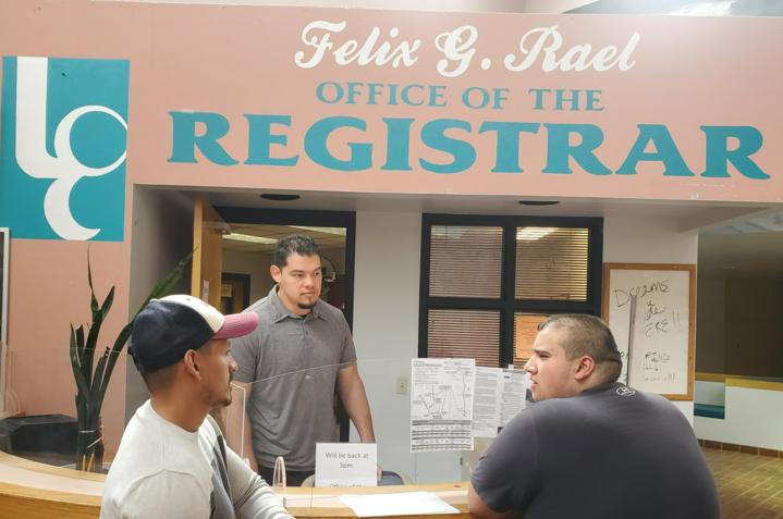 Luna Community College student Mateo Vigil (right) talks with student advisor Pablo Hernandez (left) and with student specialist Robert Salgado on Monday, June 5. Vigil, a math major and native of Las Vegas, registered for summer classes.