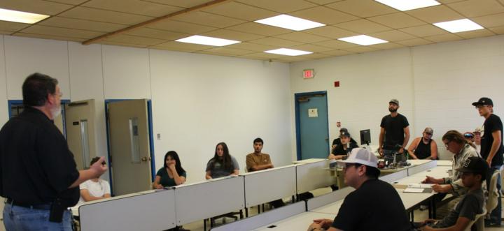 Luna welding instructor Gene Martinez speaks with his students earlier this week during the first day of fall classes.