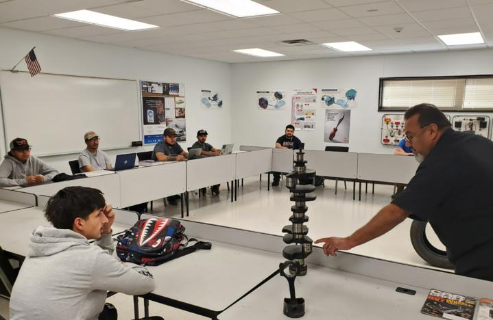 From left to right are Luna students Amador Jay Lara, Brian Vigil, Justin Romero, Juan Galindo, Sean Cobos, Angel Fresquez and Luna Automotive Technology instructor Gene Sandoval. Sandoval is explaining to students the importance of inspecting a crankshaft for taper wear and out of round on main and connecting rod journals.