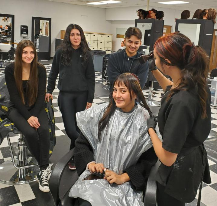 Luna Community College cosmetology student Julia Archuleta gets a haircut from senior student Victoria Lara while Desiree Trujillo, Mariah Herrera and Elijah Jaramillo observe.