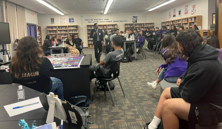 Luna President Dr. Edward Martinez speaks with Santa Rosa High School juniors and seniors, recently.