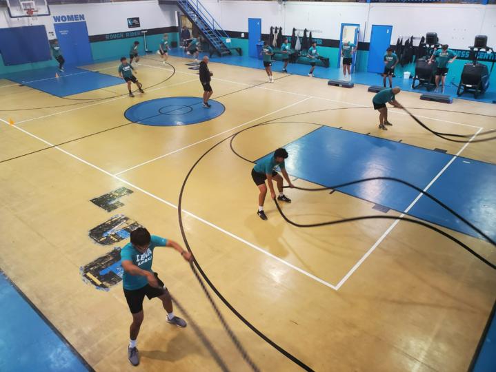 Luna baseball team works out at the Gerald Ortega Wellness Center.