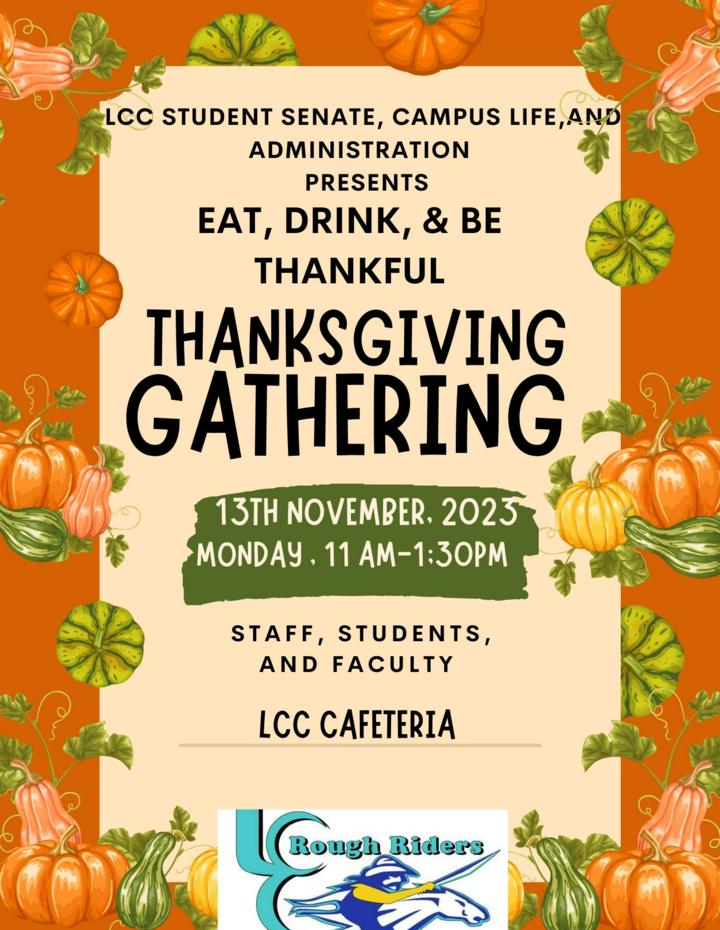 As a reminder, Luna students and employees are invited to a Thanksgiving meal gathering from 11 a.m. to 1:30 p.m. on Monday, Nov. 13 at the LCC Cafeteria.