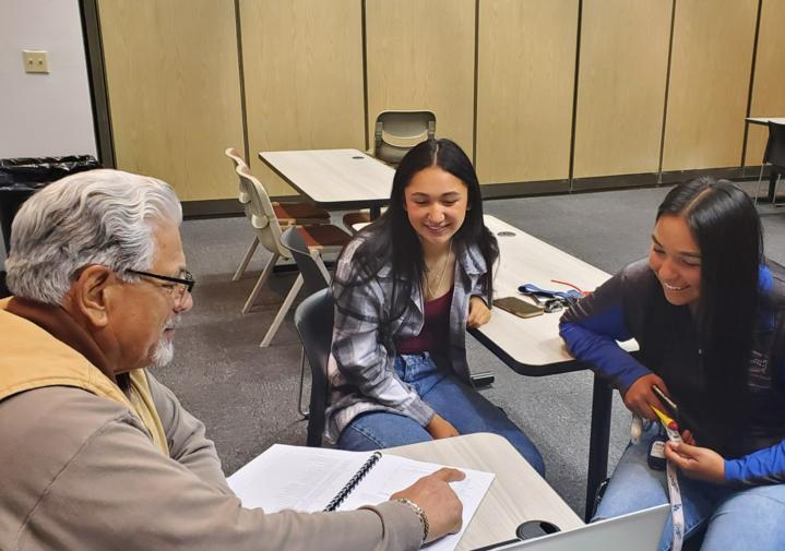 Luna students Alexis Solis and Arielle Gomez speak with Luna STEM Director Francisco Apodaca as part of Early Registration Mondays at the college.