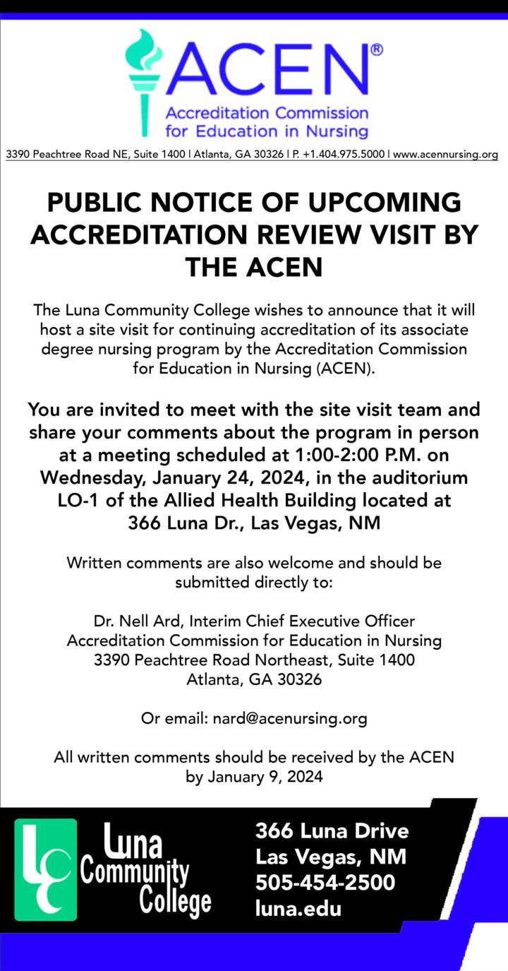 Luna Nursing Accreditation Tuesday, Jan. 23 through Thursday, Jan. 25; public meeting to be held on Wednesday, January 24, 2024