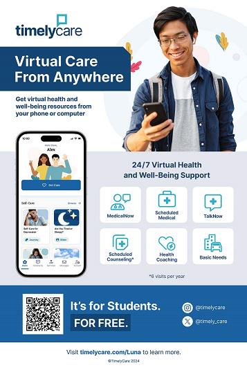 “At the forefront of our commitment to student well-being is the priority of health and safety. TimelyCare’s user-friendly platform, convenience and immediacy make it easier than ever for our students to access on-demand support,” says Luna Interim Director of Allied Health and Public Service Casey Applegate-Aguilar. “TimelyCare enhances campus resources by making care more readily available to students when they need it, limiting the spread of illness, reducing the stigma of mental health issues, and granting peace of mind to students and their families.”