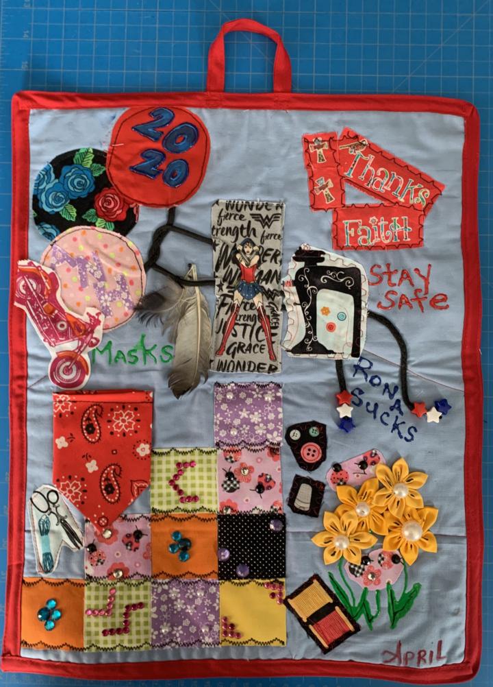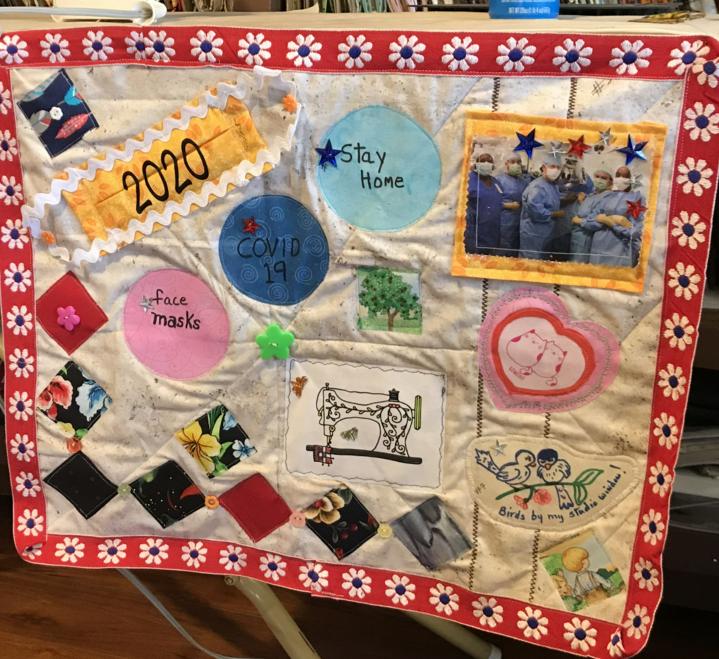 “In my quilt, I featured a doctor’s mask and flowers, along with beads and embroidered embellishments,” said Alison Larance. “I felt a little disconnected creating this quilt, as I am an essential worker and my day-to-day life hasn’t changed much, unlike most others. The greatest change has been to my daily commute. Still, I enjoyed putting together the pieces of this quilt and the time spent contemplating the new world we’re in now.”