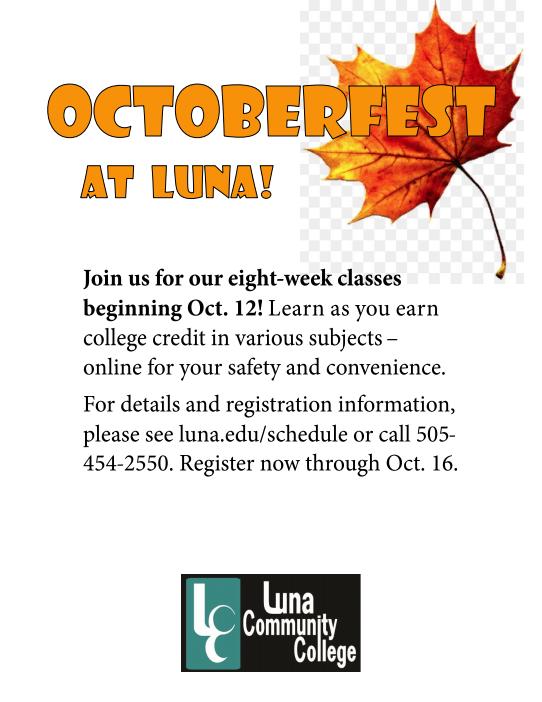Luna Community College is offering a number of eight-week courses set to begin the week of Oct. 12. Registration for the classes is now open and will continue through Friday, Oct. 16.