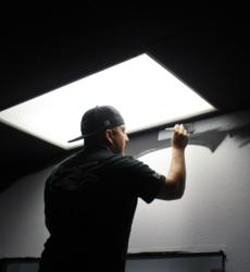 Luna physical plant employee Matthew Borrego puts some finishing touches around a light fixture at the old humanities building recently in preparation of the college’s Law Enforcement Training Center. Also pictured is a room where one of the simulators will be housed.