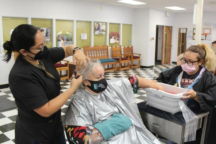 Luna cosmetology students Victoria Silva and Mackenzie Gonzales perform a haircut and paraffin hand wax on Luna Vice President Dr. Dani Day, recently. To set up an appointment with a Luna barbering or cosmetology student, please call 505-454-5344. If you are calling from a campus phone, please dial ext. 1045. Students answer the phone and set up the appointment as part of their training. All work is performed by students and supervised by licensed instructors.