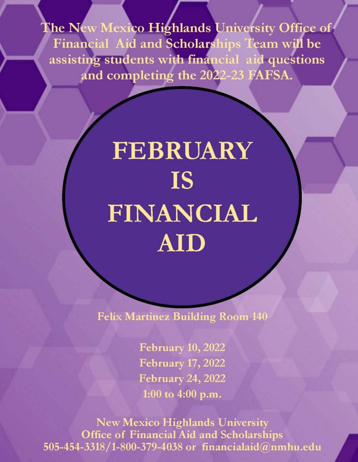 Highlands University’s Office of Financial Aid will be assisting HU and Luna students with completing the 2022-23 FAFSA and will answer financial aid questions from 1 p.m. to 4 p.m. on Thursday, Feb. 10, Thursday, Feb. 17 and Thursday, Feb. 24 in room 140 at the Felix Martinez Building.