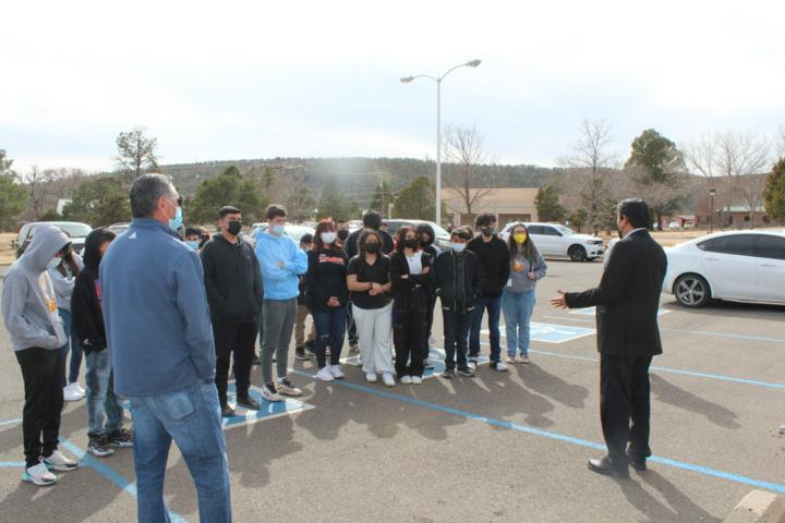 Luna Community College President Dr. Edward Martinez speaks with Taos Middle School students during a campus visit on Thursday, March 3. Martinez is scheduled to speak to several area students in the coming weeks.