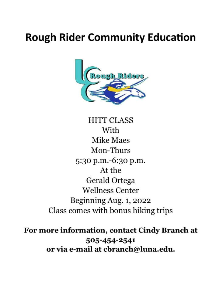 Luna Rough Rider Community Education to offer HITT Class. For more information, contact Cindy Branch at 505-454-2541 or via e-mail at cbranch@luna.edu.