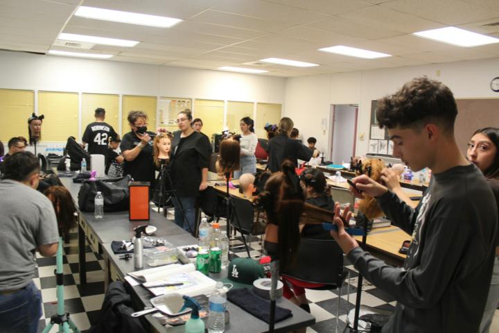 Luna first year cosmetology and barbering students (top photo) get practical experience as they work on mannequins under the direction of longtime instructor Germaine Sandoval.