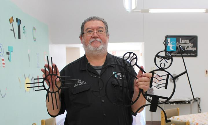 Luna Welding Instructor Gene Martinez poses with the three trophies he and his students worked on for the winners of todays’ Luna Free Throw Contest.