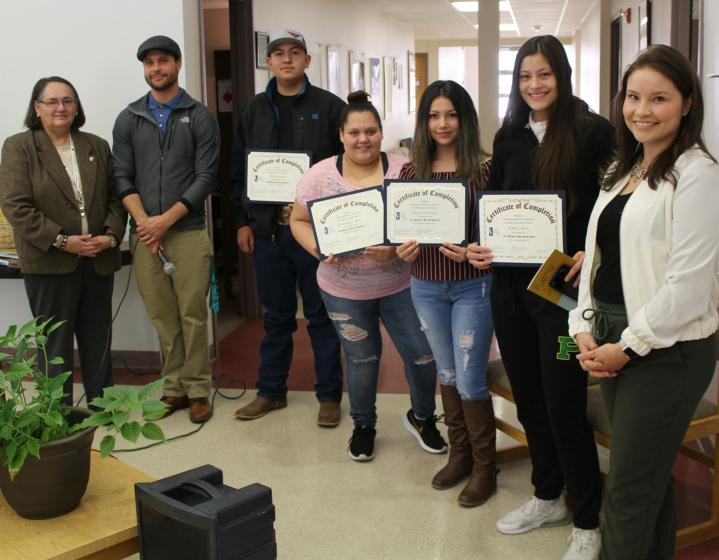 Luna Humanities Director Dr. Anita Roybal and developmental coordinator Nathan V. Baker present honorary certificates of completion to Luna students and journal contributors Dillian Lucero, Dominique Maes, Briana Sanchez, and Faith Flores at the reading and journal launch of “Puente Juntos,” a Luna literary magazine of student poetry and prose on March 18. Also presenting was Luna instructor and co-editor of “Puente Juntos,” Justine Crespin.