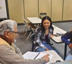 Luna students Alexis Solis and Arielle Gomez speak with Luna STEM Director Francisco Apodaca as part of Early Registration Mondays…